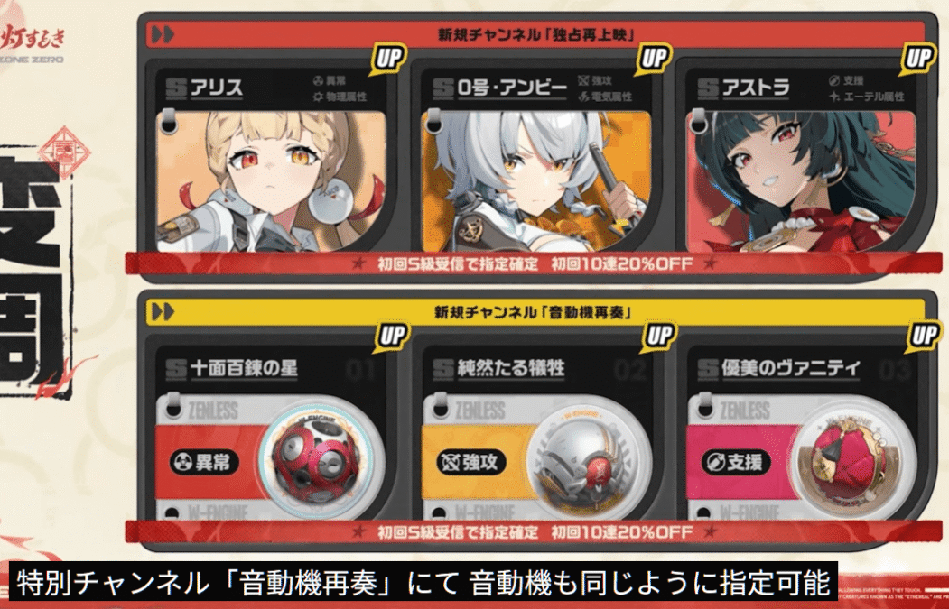 音動機もキャラ同様に初回S級受信で指定確定、初回10連20%OFF